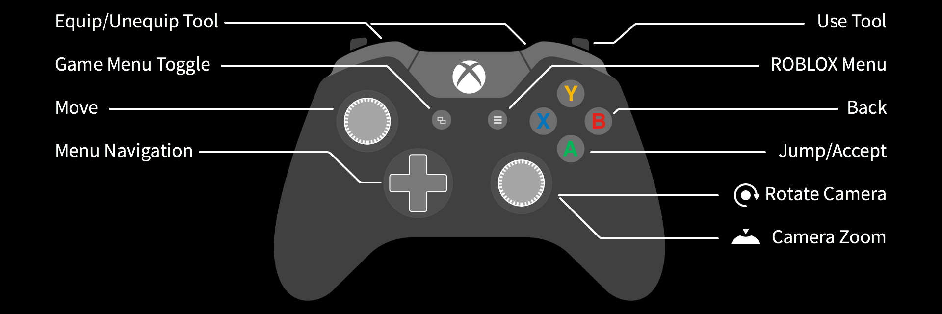 Note: This controller map can be accessed at any time in-experience by clicking on the "Roblox Menu" button shown above, then selecting the Settings option (press up on the left thumb-stick), and clicking the Right Bumper (RB) to access the Help tab.